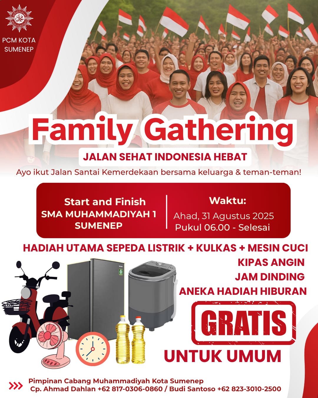 Jangan lupa ajak keluarga, tetangga, dan teman. Mari kita isi kemerdekaan dengan semangat sehat, kebersamaan, dan keceriaan di Jalan Sehat Indonesia Hebat bersama PCM Kota Sumenep pungkas Mardi.