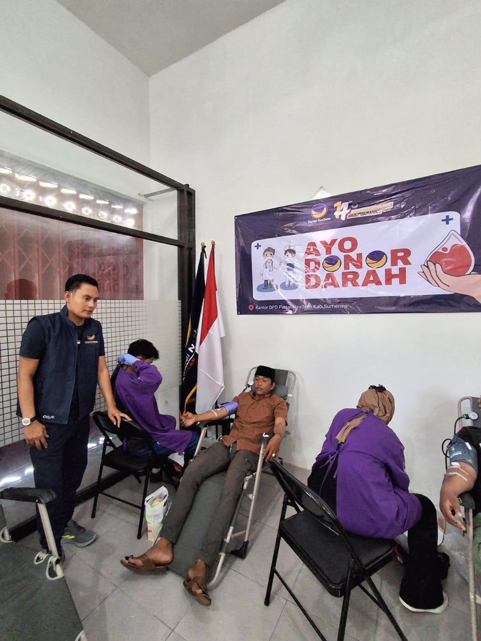 Ketua DPD Partai NasDem Sumenep, Akis Jasuli, menyampaikan bahwa kegiatan donor darah ini merupakan bagian dari rangkaian peringatan HUT ke-14 Partai NasDem yang mengusung tema “Konsisten Membawa Arus Perubahan.”