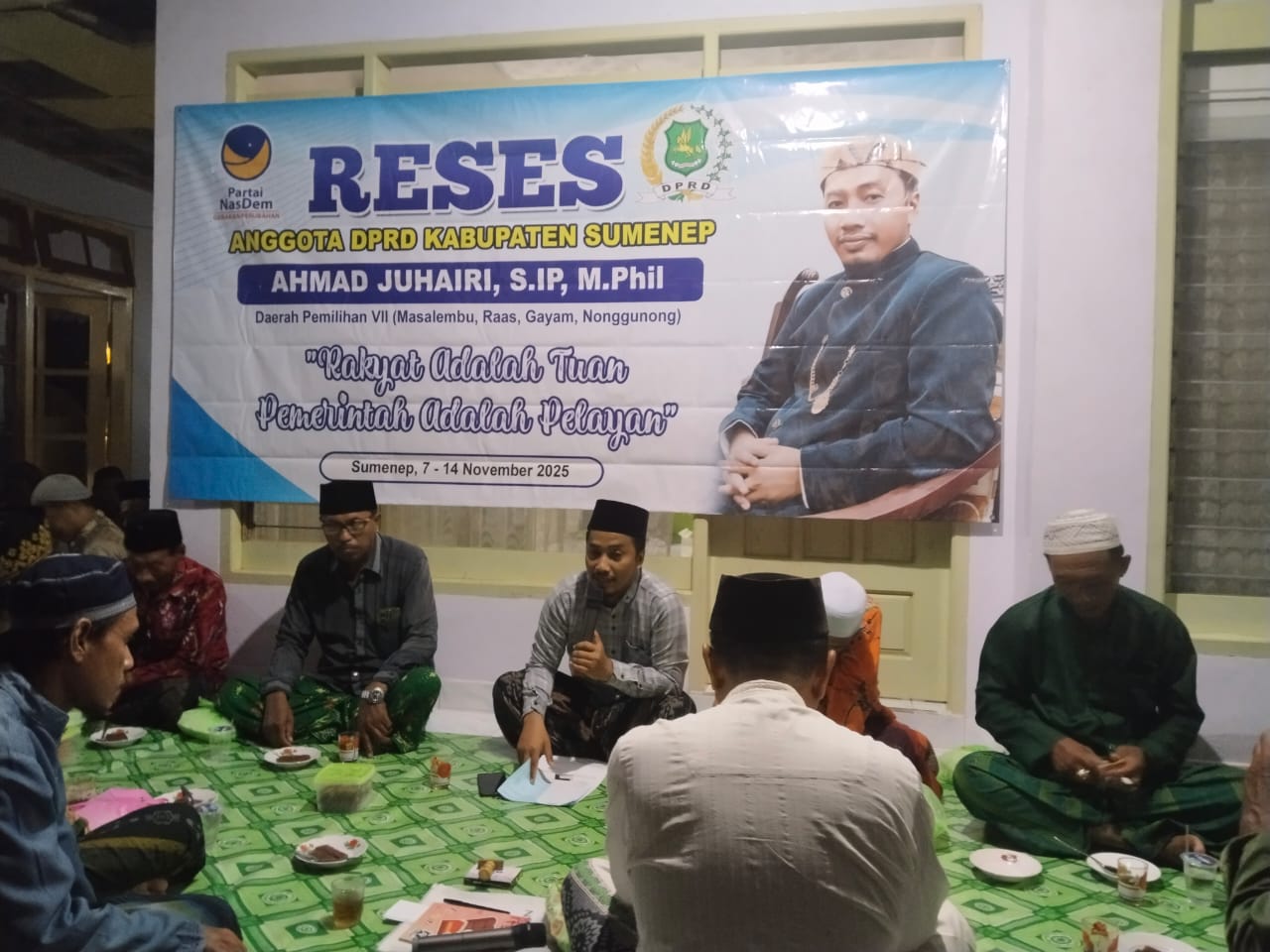 Sumenep Okaranews.id – Anggota DPRD Kabupaten Sumenep dari Fraksi NasDem, Ahmad Juhairi, S.IP., M.Phil., menggelar kegiatan reses tahun 2025 di wilayah kepulauan Kabupaten Sumenep. Reses yang berlangsung sejak 7 hingga 14 November 2025 tersebut difokuskan pada Daerah Pemilihan (Dapil) VII, meliputi Kecamatan Masalembu, Raas, Gayam, dan Nonggunong.