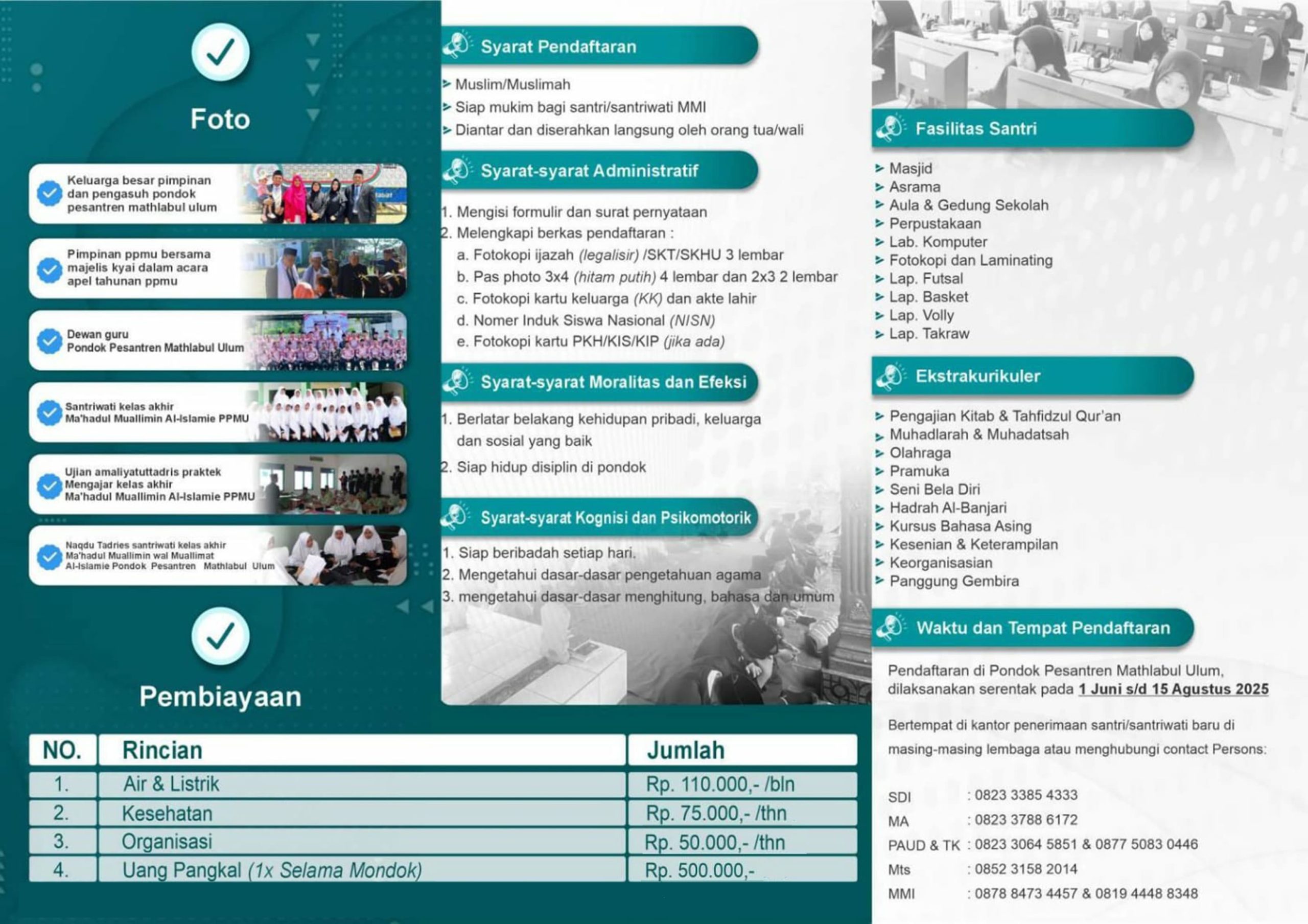 Pendaftaran dibuka 1 Juni hingga 15 Agustus 2025 dan dilakukan serentak di semua unit pendidikan. Calon santri dapat langsung mendaftar melalui kantor penerimaan masing-masing lembaga dengan menghubungi kontak person yang tertera.