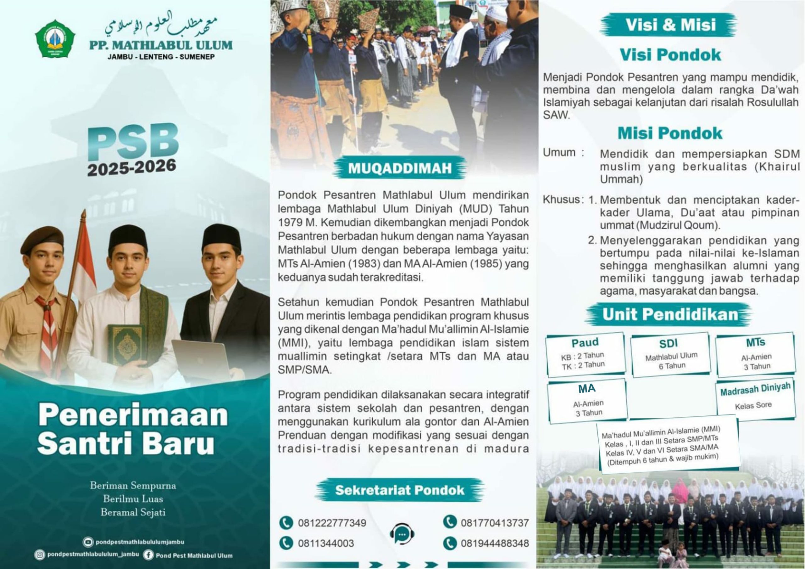 “Yuk mondok! Bergabung bersama keluarga besar Mathlabul Ulum dan jadi generasi yang berakhlak, berilmu, dan berdaya guna.”