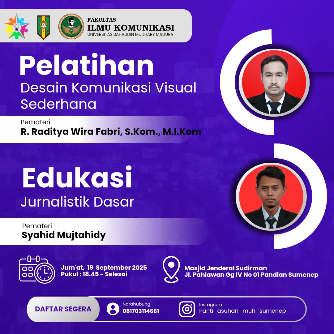 Sumenep okaranews.id – Fakultas Ilmu Komunikasi Universitas Bahaudin Mudhary Madura (UNIBA Madura) terus menunjukkan komitmennya dalam meningkatkan literasi komunikasi di kalangan generasi muda. Hal ini diwujudkan melalui kegiatan Pelatihan Desain Komunikasi Visual Sederhana dan Edukasi Jurnalistik Dasar yang dijadwalkan berlangsung pada Jumat, 19 September 2025, di Masjid Jenderal Sudirman, Jl. Pahlawan Gg IV No. 01 Pandian, Sumenep, mulai pukul 18.45 WIB hingga selesai.